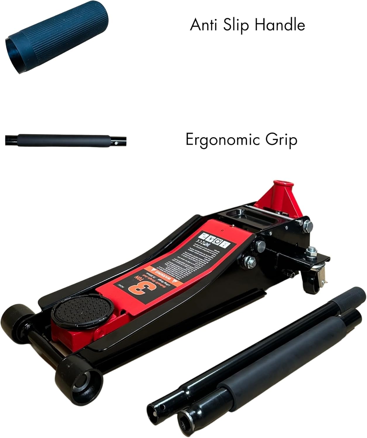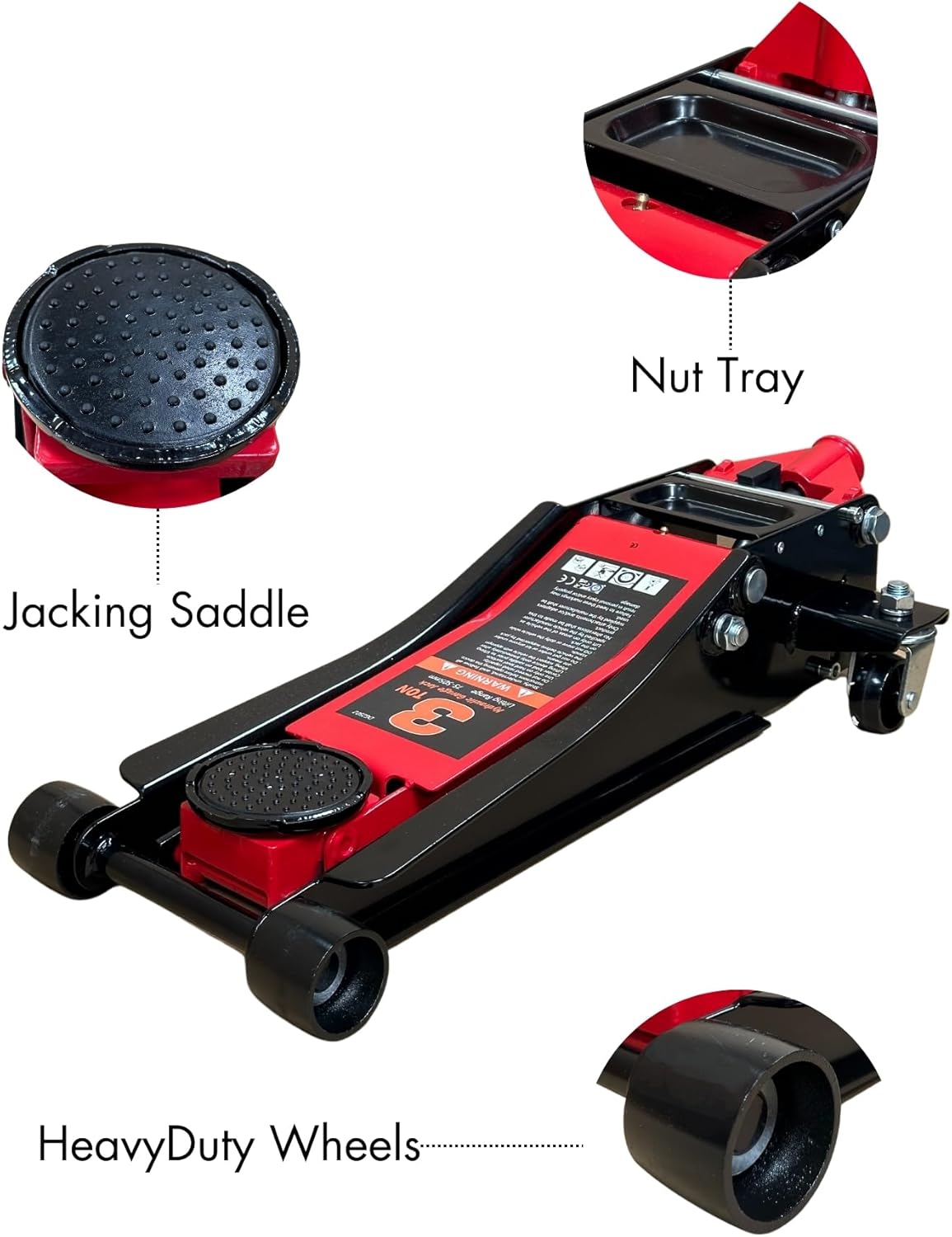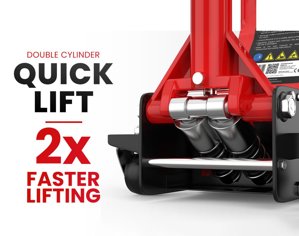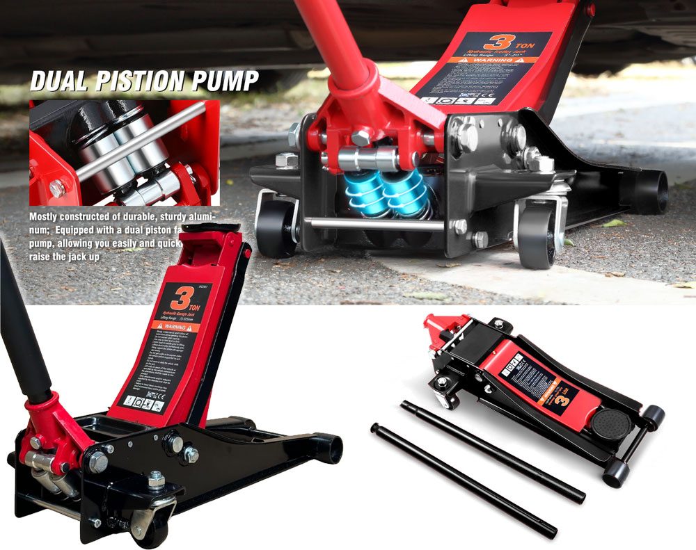 The 3-ton Hydraulic Low Profile Trolley Jack (Double Pump) lifts up to 3000kg and features an all-welded steel construction for ultimate durability. It's fitted with an overload protection system for added safety. This trolley jack is made of heavy-duty steel to help substantiate its quality and durability. When pressing the handle doesn't need much effort, the object will rise. Put it in the trunk of the car, and next to the roadside trees, you can quickly repair it.