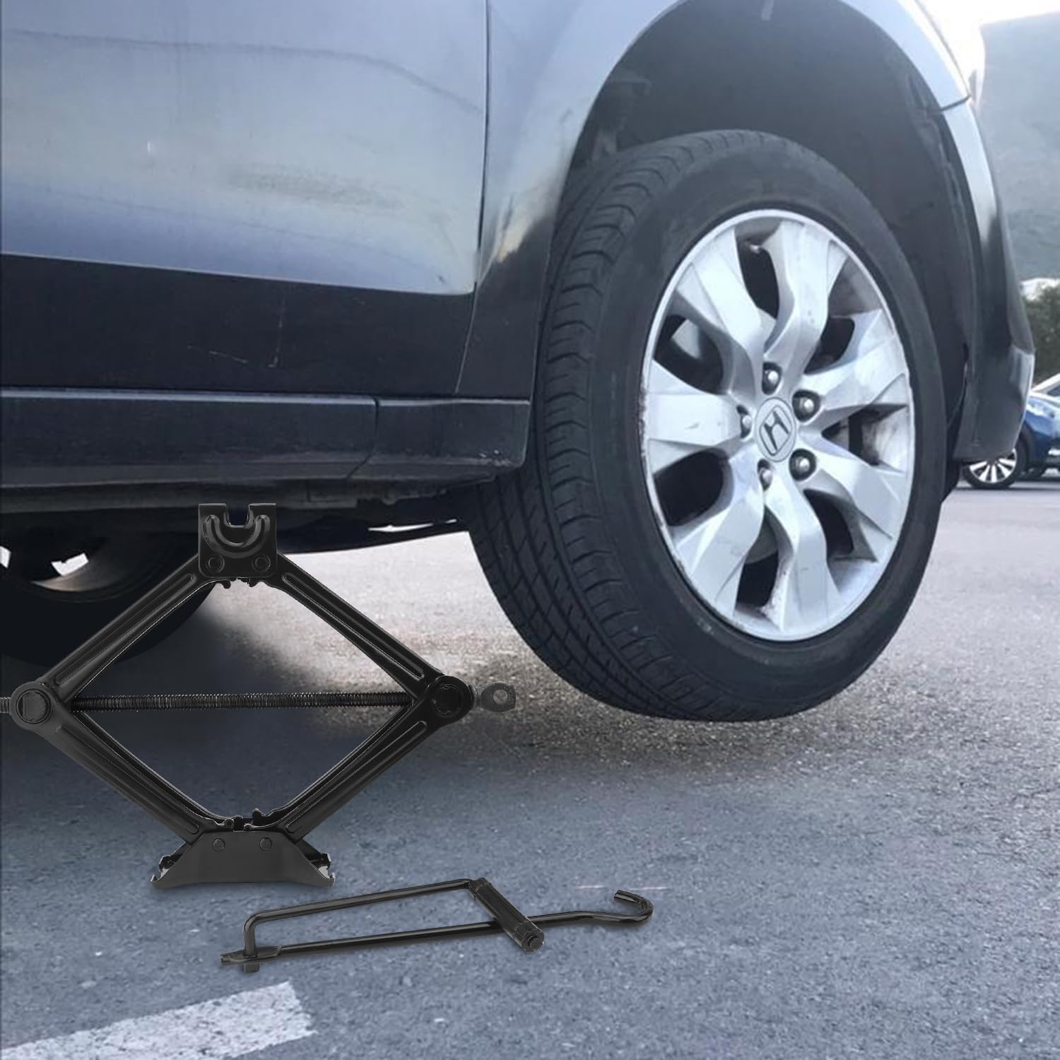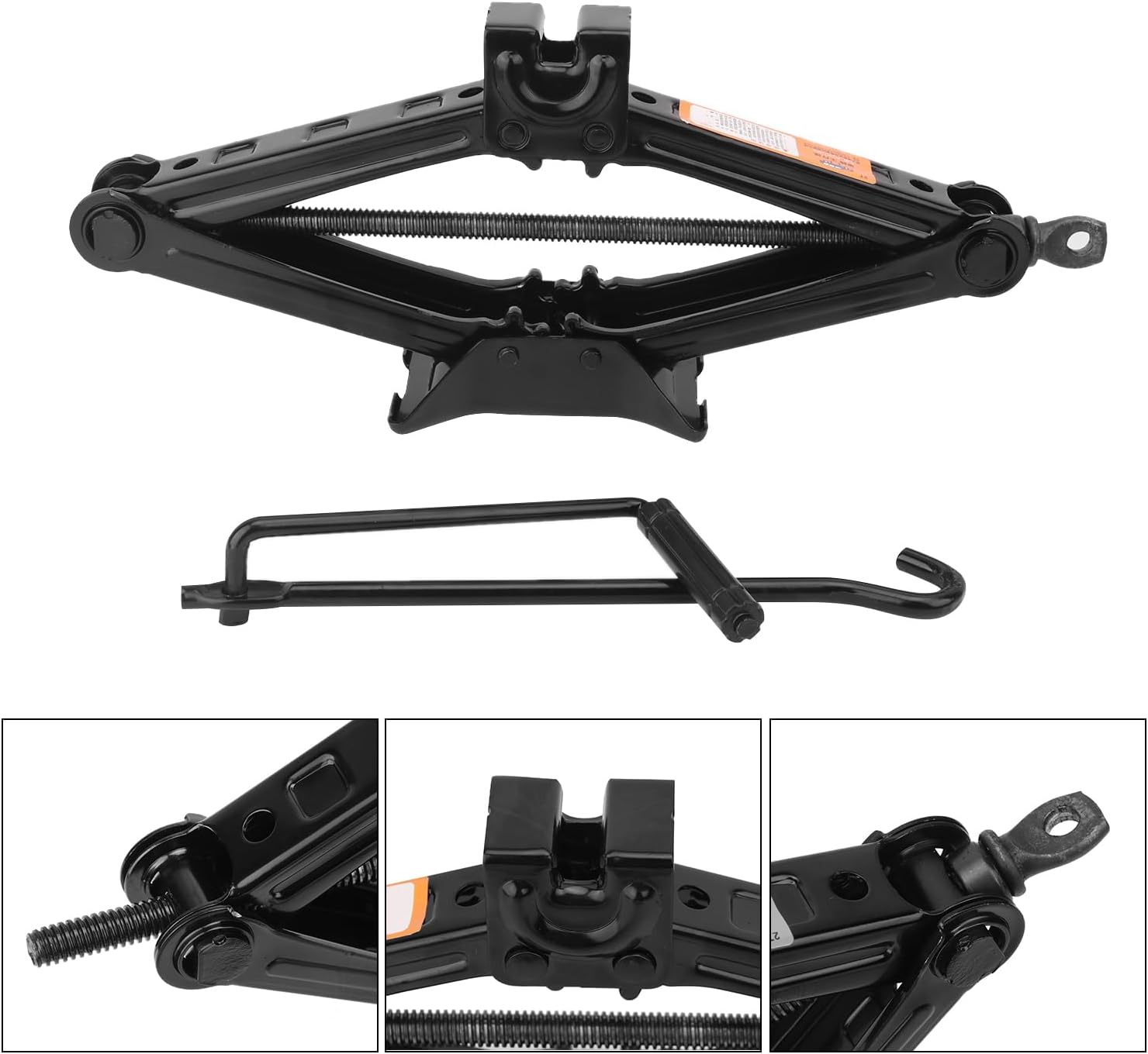 This scissors jack has straight equal-length arms,i.e the distance from the horizontal-jack-screw attachment point to the scissors-joint load platform . The extension or displacement motion is achieved by applying force to one of the supports, resulting in an elongation of the crossing pattern.